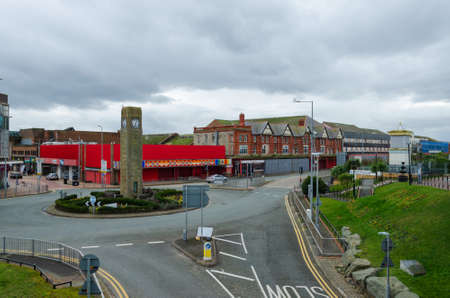 Rhyl, Denbighshire; UK: Feb 21, 2021: A general street scene showing the clock tower roundabout with the soon to be demolished and redeveloped Queens Buildings.