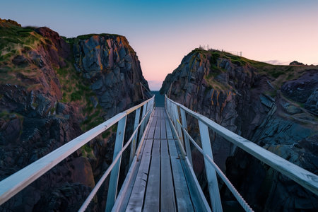 A wooden suspension bridge stretches between jagged cliffs under a vibrant sunrise sky. The elevated passage offers access to rugged terrain where grassy edges meets rocky features.