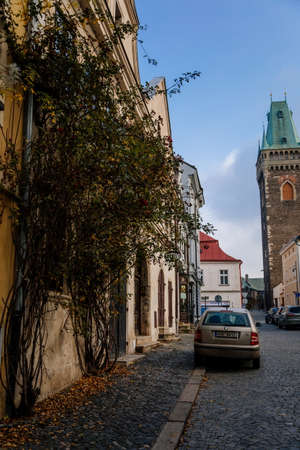 Narrow picturesque street with colorful buildings in old historic center in Kolin, Gothic Cathedral with belfry, Medieval stone St. Bartholomew? S Church, Central Bohemia, Czech Republic, November 28, 2020