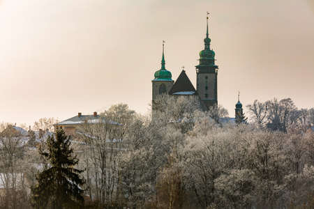 Church of St. James the Greater in Jihlava is a three-aisled hall church with a long presbytery and two tall towers in winter with evening sunset