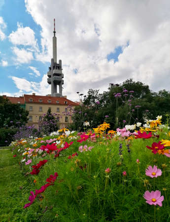 Zizkov Tv Tower and blooming flowers in the park Prague Czech Republic stock images. City Park in Prague stock images. Urban landscape photo. Beautiful place in Prague