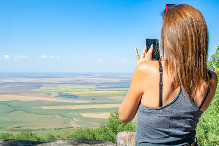 rear view of a beautiful girl who takes pictures of the landscape