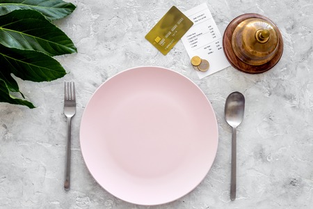Ask for the bill at cafe. Service bell near empty plate, bill and bank card on grey stone table top view.