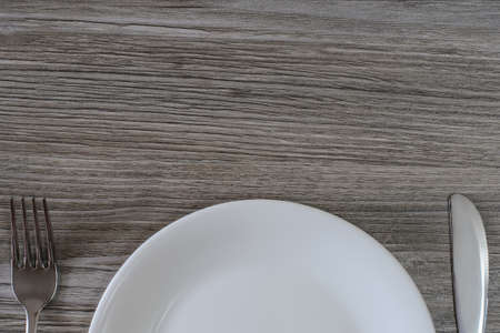 Empty white plate with cutlery on a marble table, saucer, fork and knife. The concept of diet, fasting