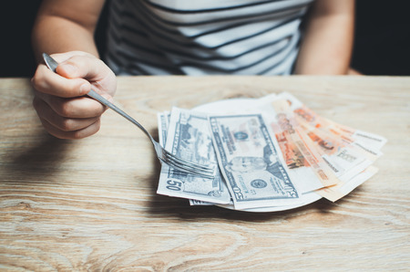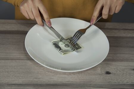 the girl is going to dine with a one dollar bill, which lies on her plate, close up