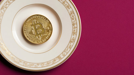 This striking image features a golden bitcoin displayed elegantly on a luxurious plate, set against a rich and vibrant background. It symbolizes modern finance and digital currency.