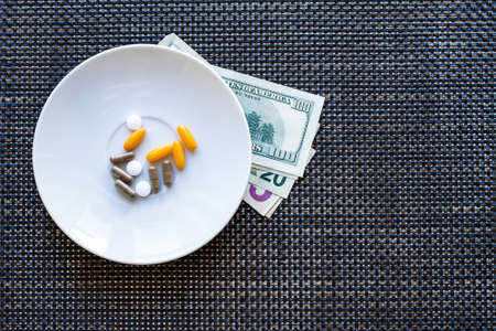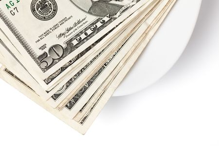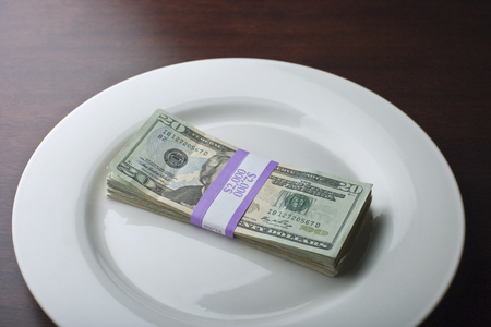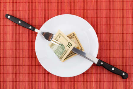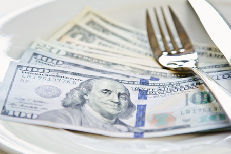 Hundred dollar bill on plate, with fork and knife on isolated white background. High quality photo