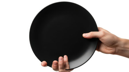 Close up photo of waiter holding empty plate for product advertisement mock up.