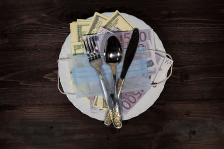 Money spent on food concept on black backgorund. Euro currency and coins on plate, top view.