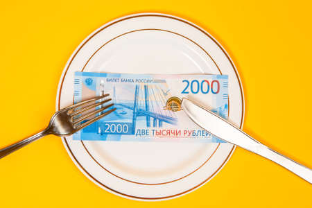 A new pattern of a new sample of two thousand rubles. The banknote of Russia lies in a plate. Subsistence level in Russia. Money for food.