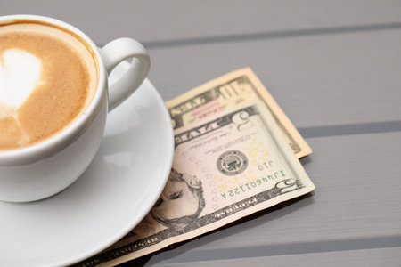 Top view of man hand paying bill at cafe or restaurant with cash, takes money banknotes from the wallet puts on the plate with receipt.