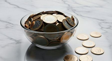 Aesthetic Glass Bowl Filled with Mixed International Coins on a Smooth Marble Countertop