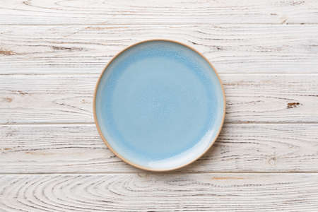 Top view of empty blue plate on wooden background. Empty space for your design.