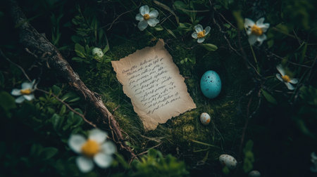 A captivating nature scene featuring a vintage letter beside a blue egg, surrounded by delicate flowers and soft greenery, evoking tranquility and beauty of spring.
