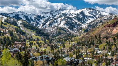 Mountains surround a vibrant alpine resort village as spring thaw takes place, revealing greenery and rolling clouds in the sky.