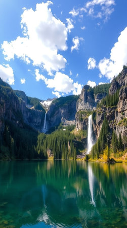Tranquil waters of a lake mirror the bright hues of autumn foliage and towering mountains. Fluffy clouds float above, enhancing the peaceful atmosphere of the scene.