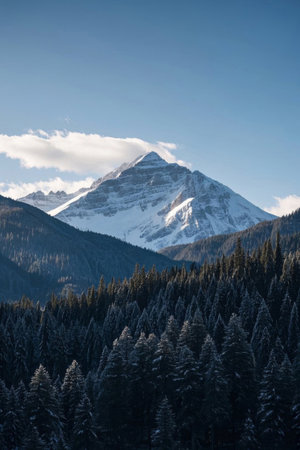 Mountain landscape with snow-capped peaks and coniferous forest