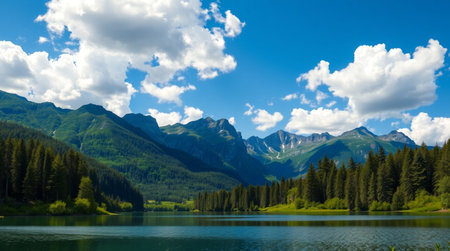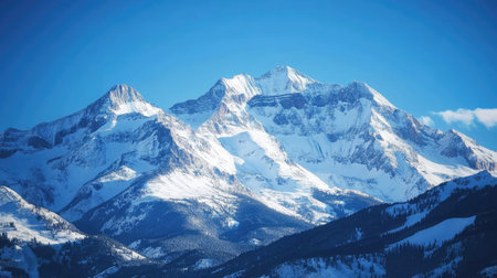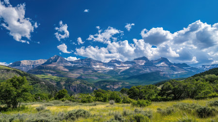 A panoramic view of towering mountains against a brilliant blue sky epitomizes summer beauty.