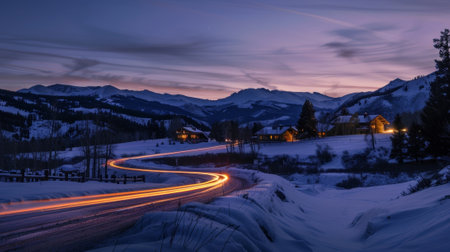 As the sun sets behind the mountain range car light trails guide visitors to cozy lodges off the beaten path