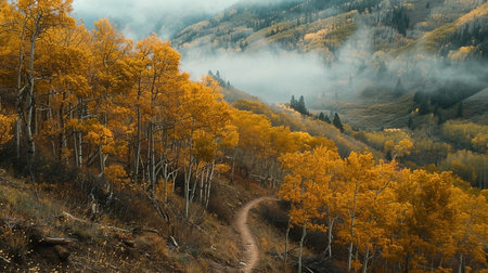 A winding trail cuts through a mountain hillside ablaze with golden aspen trees during the peak of autumn. Mist gently weaves through the valley below, adding an ethereal touch to the scene. It evokes feelings of adventure, solitude and natural beauty.