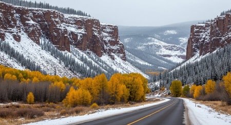 A dramatic mountain landscape featuring a winding asphalt road cutting through a deep canyon. The scene captures a striking contrast between the last vestiges of autumn and the arrival of winter. Vibrant yellow and orange foliage from deciduous trees lines the lower slopes, while snow dusts the higher ground and evergreen trees. Towering, rugged rock cliffs rise on either side of the canyon, and the sky is overcast, contributing to the cool, crisp atmosphere.