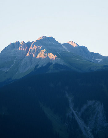 Mountain landscape with snowcapped peaks at sunset, Switzerland.