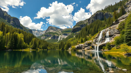A stunning view of a calm lake reflecting majestic snow-capped mountains and vibrant green trees, capturing the essence of serene natural beauty in spring.