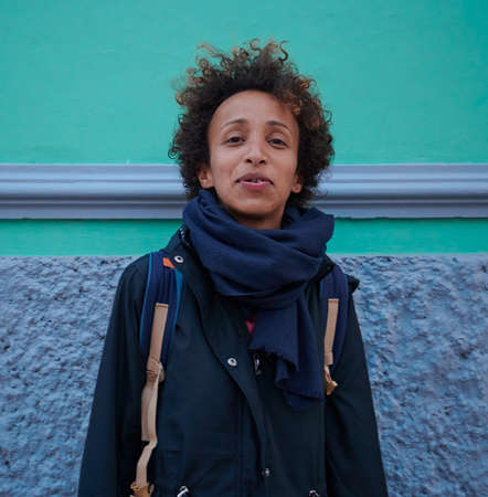 Side view portrait of an african american man wearing a yellow shirt standing in front of a colorful painted wall