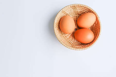 Fresh chicken eggs ( Telur Ayam Kampung ). White eggs with copy space. Top view.