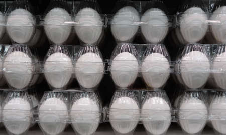 Clear trays of eggs on the refrigerated shelf at grocery shop