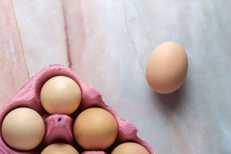organic eggs in egg box on white marble kitchen table, closeup
