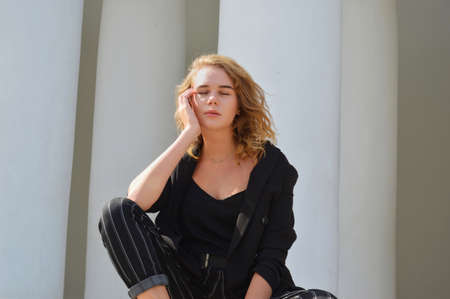 A pretty teenage girl n a business black suit is sitting