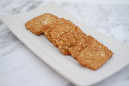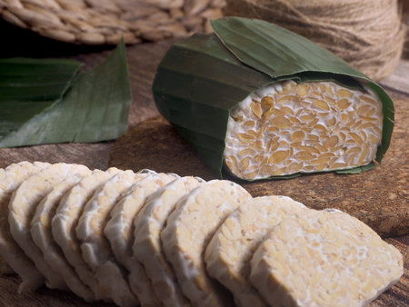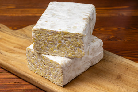 Tempeh made from fermented soybeans, Traditional Indonesian food, Healthy vegan and plant based ingredients