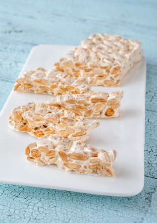 Peanut bar,crunchy sweet peanut bar which is very healthy and tasty snack,arranged in a wooden base,top view.