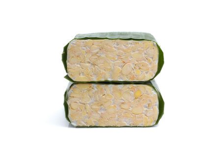 Tempeh made from fermented soybeans wrapped by banana leaf, Traditional Indonesian food, Healthy vegan and plant based ingredients