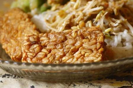 Tempe Indonesian Traditional Fermented Soybeans with Fried Meat in a Small Plate