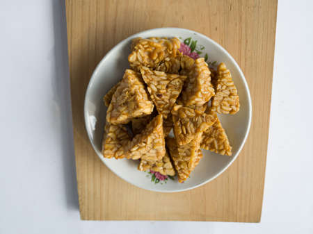 Fried tempe or fermented soybean cake from Indonesia with garnish serve on a plate in white background as conceptual photo