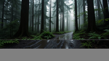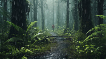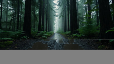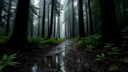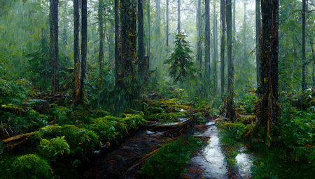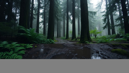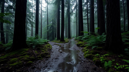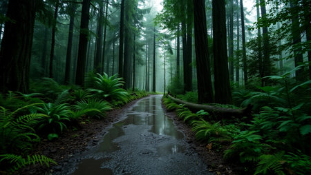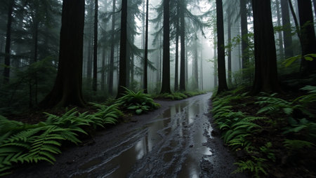 Misty Rainforest Path with Lush Ferns and Moss-Covered Trees in the Rain