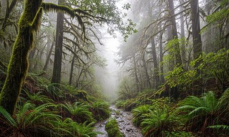 Foggy forest trail in the rainforest of California, USA