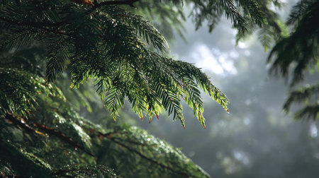 Soft rain falling gently on Douglas fir, with water droplets forming and slowly dripping. The background is softly blurred with a natural, moody atmosphere.