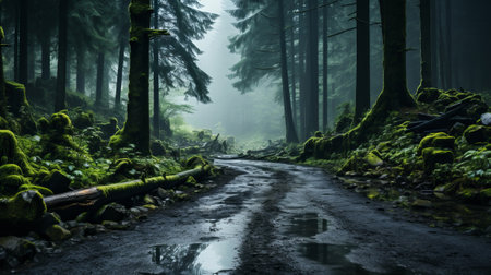 Misty road in fir forest. Minimalistic scenery. Generative AI.