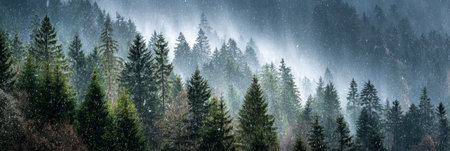 A panoramic view of a dense pine forest shrouded in mist, showcasing the ethereal beauty of nature.