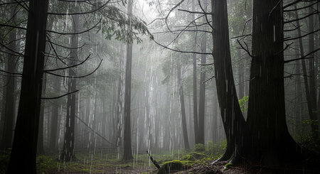Foggy forest with raindrops on the ground and tall trees