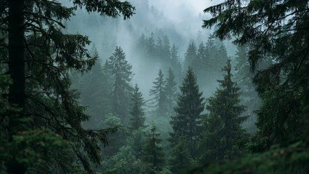 A breathtaking view of a misty forest featuring towering evergreen trees shrouded in fog. This serene natural landscape captures tranquility and beauty in nature.