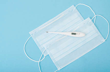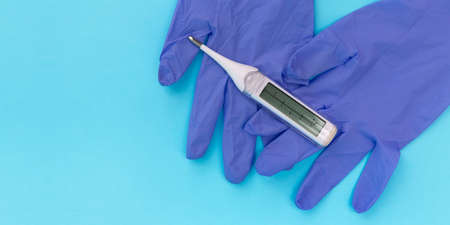 Detail of blue medical gloves with a thermometer on blue background with copy space for text. Coronavirus protection, Covid-19 concept.