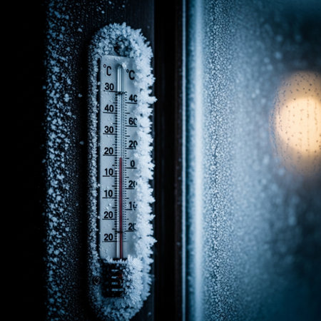 A close up image of an old fashioned temperature gauge showing very cold winter temperatures.