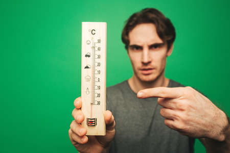 Close up young man points at thermometer, isolated on green background