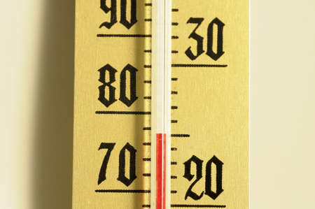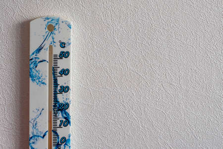 a closeup of a room thermometer isolated on the light beige background on the left side