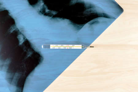 Lung X-ray and thermometer on the table with copyspace. High quality photo