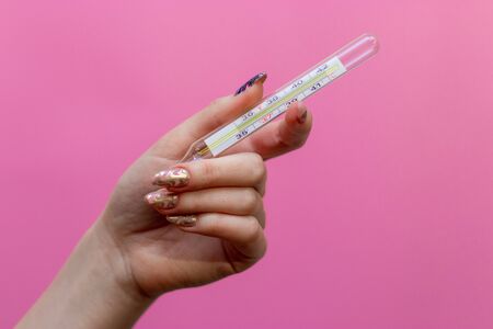 Hand in pink glove holds thermometer on pink background with copy space. Mercury thermometer in hand of paramedic. Health care system. Medical theme. Medical equipment.